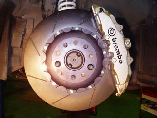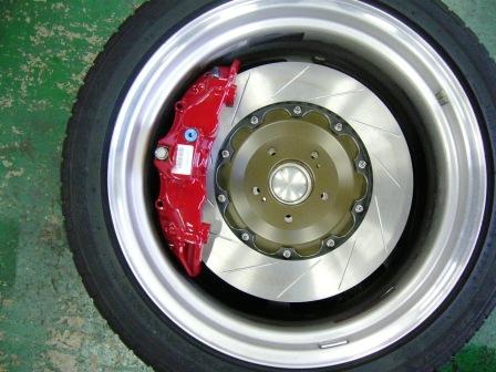 前回、6ポットキャリパーのブレーキパッドの大きさを見てから、F50キャリパーから6ポットキャリパーへの変更を考えるようになってしまった! V12の車重を考えると、現在付けているF50キャリパーではどうも心もとない! 実際に筆者のSLと同じF50キャリを付けているV8のR129と全開時から同時にフルブレーキをかけると、制動距離の違いに驚く差が出てしまう! 驚く差といっても20メートルも差が無いとは思うが、しかし、20メートルである! 過去、全開時に前方にトラックがノロノロと車線変更をしてきて、1メートル手前で難を逃れた経験がある! 1メートルとは言わないまでも、10メートル以内で危険回避をした経験は何度もある! そのことから考えると、F50キャリを付けているV8との制動距離の差を少しでも縮めたい! 現状では、V8と走りに行く時は、危険予測をしながら彼らよりかなり手前でブレーキを踏むようにしているのだが、結構神経を使うので疲れる! 筆者のSLのホイルにギリギリで6ポットキャリが入りそうなのだが、実際に付くかどうか分からない。 そこで、ホイルを外してフィッティングしてみる事にした。 ホイルとキャリパーの間が1センチほどまだ余裕がある!(これを余裕と言っていいのかどうかは疑問だが・・・) なんとかなりそうである! ならば、この際思い切って購入を決断するか!・・・! だが、詳しく調べると、ステアリングを目いっぱいきった際にタイロットがブラケットに当たってしまうらしい! ブラケットを少し削れば回避は出来るみたいだが、そんなアホみたいな事はしたくない! 残念だ! ではでは、・・・8ポットキャリパーはどうだろうか!?