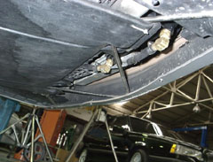 | T号はブラバス製のエアロをフロントとリアに入れている。 ある日、高速道路で全開走行をしている時に「ピューーーッ!」と言う異音が車内に響き渡った! 風圧でハードトップのフロントの合わせ目から風が入り込んでいる音だ! このスピードなら、風が入り込んでもおかしくないな!と筆者は思った。 しかし、次の瞬間、筆者の脳裏を横切ったものは、「T号のフロントスポイラーは、この状態ではいったいどうなっているのだろうか!」と言う疑問だった。 性格はいい加減なくせに、こういう所には良く気が回る! 自分ながら感心する! 早速、近くのPAに入り込んで、フロントスポイラーを手で軽く押してみた! AMGのR129後期型エアロのように風を車床に逃がすような設計になっているのなら話はわかるが、ブラバスのエアロの形状を見る限りにおいては、風を押さえ込むような形状になっている。であるならば、しっかり形状どおりの仕事をしてもらわなければ意味が無い! 後期型エアロを身にまとったSLのシルエットは美しい! 筆者は個人的には後期型エアロのデザインがとても好きだが、風を車床下に逃がす設計はどうも好きになれない。 と言う訳で、アルミのステーを作りスポイラーの裏側からシッカリと固定することにした。 固定後、力いっぱい手で押してみたが、これでスポイラーはピクリとも動かなくなった。 |