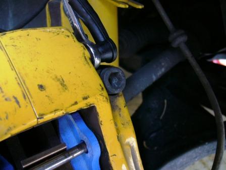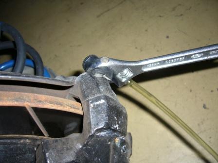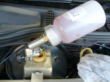 はたして、エアをかまずにちゃんとブレーキフルードを交換できるのだろうか! 結果は、とっても簡単で問題なく全量交換を終える事ができた。 手順は、フルードタンクに補充ボトルをセットして、フルードブリーダーを電動エアポンプに接続してスイッチON、そしてブリーダーバルブを緩める。 以上、単純な作業だ。 これを4箇所行えば良い。