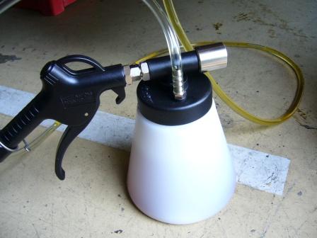 フルードの交換作業は今まで何回も行っているのだが、交換作業は一人がブレーキを踏む係りと、もう一人はブリーダーバルブの開閉係りに分かれて二人で行ってきた。 しかし、今回は一人で交換作業を行うために、こんな武器を購入した。 電動エアポンプに接続して、エアの負圧によってフルードを吸い込むブレーキフルードブリーダーだ。