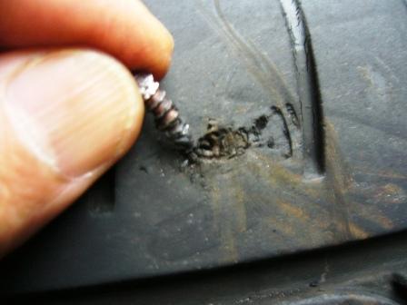 深く刺さっていたら、エアが抜けるので修理が必要になる。 だからと言って、このままにしておくわけにもいかない。 恐る恐る、ラジペンで引き抜いてみた。 ネジだ! でも、深くはない。 これなら走行に支障はない、大丈夫だ。