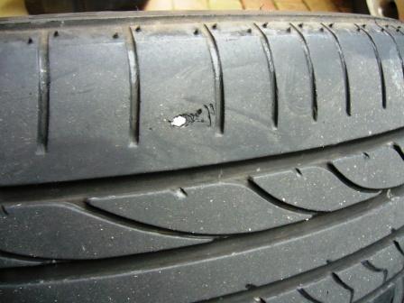 このブーツは、だいたい6〜8万キロくらいで駄目になるらしい。 乗り方にもよるのかもしれないけど、ながくても10万キロが寿命じゃないのかな。 パッド交換が完了して、早速試運転に第三京浜道へ向かう。 特にベディング(新品のパッドにアタリを付けるため、ハードな走りをする前にあらかじめ熱をパッドに加える作業)は必要ないみたいだけど、一応、ベディングをやっておいても害はないので行った。 MX72のインプレだが、パッドが冷えきっている時の制動力は、以前のCCXと変わりはないのだが、その後の制動力の立ち上がりは早いと思う。 少しでも熱が入れば、充分な制動力を発揮してくれるパッドだ。 MX72は、筆者のVOLVOに装着してあるブレンボのキャリパー&ローターには相性がいいのかも。 ブレーキ鳴きは全くない! ただ、贅沢を言えば、ダストの量が多いようだ。 もっとも、ダストの量と制動力は比例しているようなもの!とよくいうので、この手のパッドを選ぶ人はダスト量などは気にしないだろうね! ところで、毎度ながら、恒例のタイヤ点検を行う。 おや〜、何か釘のようなものが刺さってるぞ! いや〜な予感が・・・