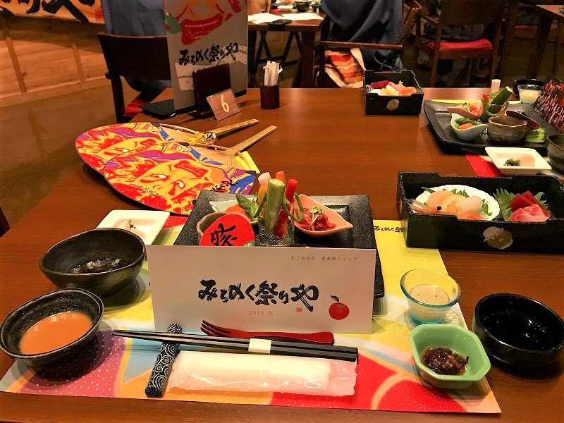 食事は、[みちのく祭りや]で、青森四大祭りとして有名な[青森ねぶた祭り]・[弘前ねぷたまつり]・[八戸三社大祭]