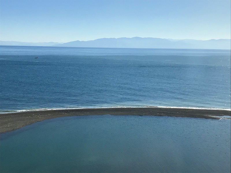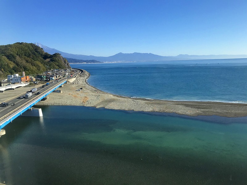日が替わり、朝、ホテルの窓からの景色。 駿河湾が見える。