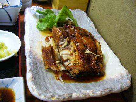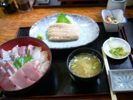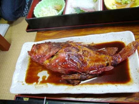 無線での会話も少なく静かだ! きっと皆も眠いのだろうな! 腹もすいてきた。 昼食場所までもう少しだ! おおお! やっと目的地に到着! 正直言って、ここで昼を食べる為に企画したようなツーリングのだからね! 旨いぞーー! 人気があるだけあって、駐車場もイッパイだ! 無理やりスペースにVOLVOをねじ込んだって感じだ! これが、お勧めの金目鯛定食だ。 これにデカイ金目の姿煮がついてくる! こちらは、かさご定食のかさごの姿煮だ。 筆者が注文したのは、二階建て海鮮丼。 魚の揚げ物ついている。 う〜ん、これも美味い! 睡魔と闘いながら着た甲斐があった。