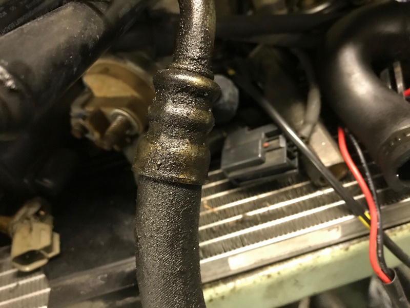 エンジンオイルを補充して下周りを洗浄し、エンジンをかけてから1日置いて再度下周りを見ると、エンジンオイルクーラーホースのカシメ部分から漏れているのが分かった!