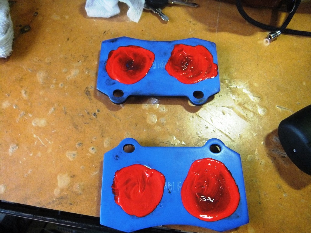 この赤い鳴き防止剤は、筆者が以前パッド交換した時に使用した防止剤だ!