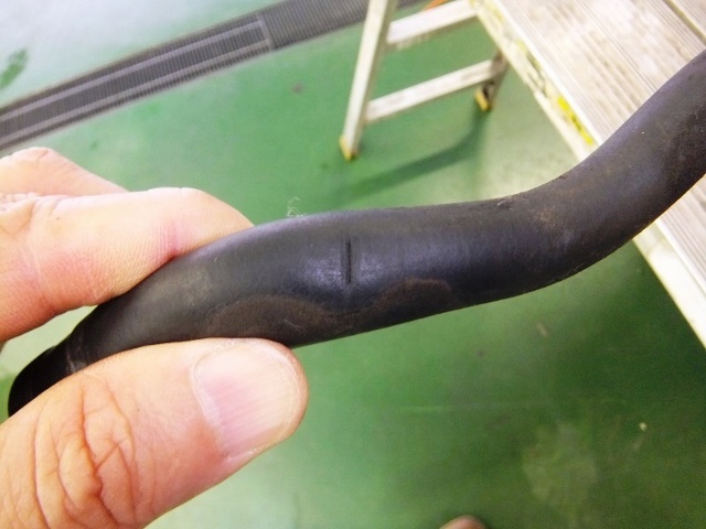 外したリターンホースを点検すると、亀裂が・・・! やはり、これがガソリン漏れの原因か!