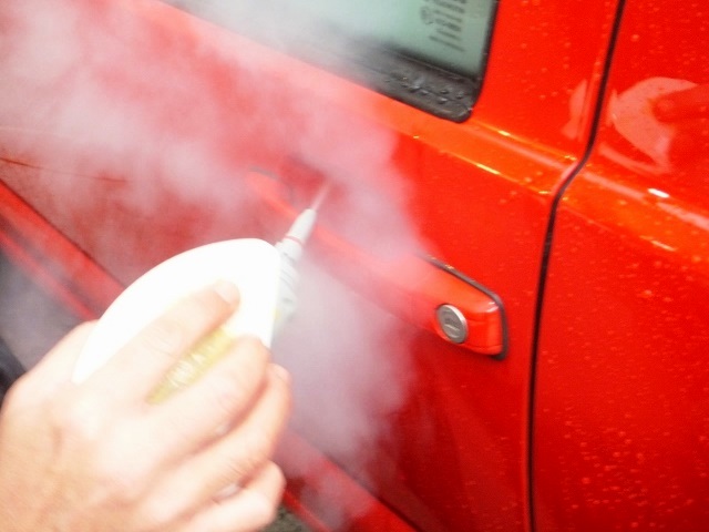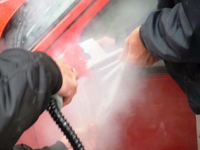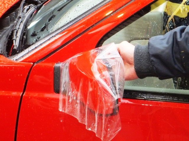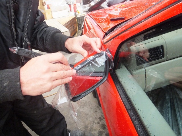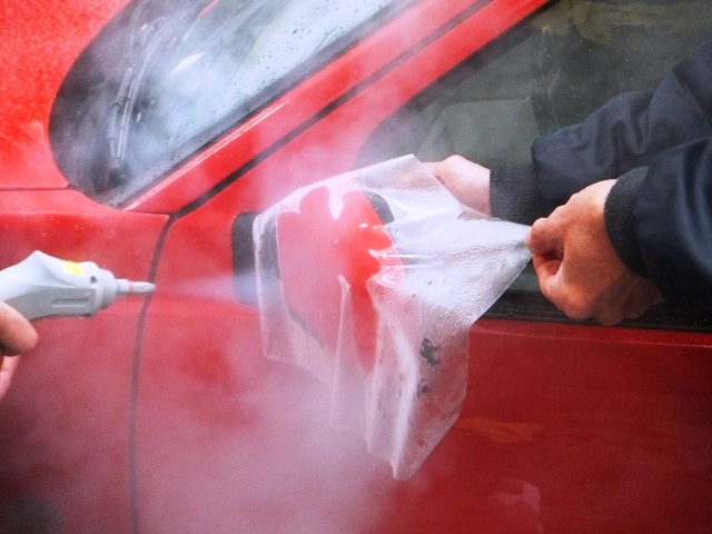 プロテクションフィルムは2面になっており、糊面のフィルムを剥がして高温蒸気を吹き付けながらフィルムを柔らかくしてから貼る。