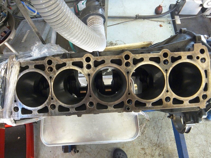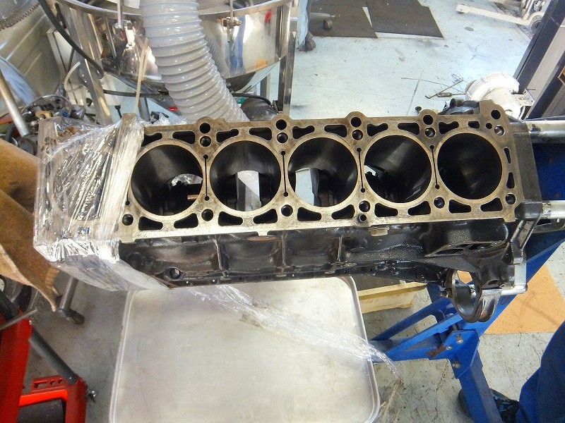 シリンダーブロックはハンガーに掛けられたままの状態で、オーバーサイズピストンの到着待ちになっているようだ。