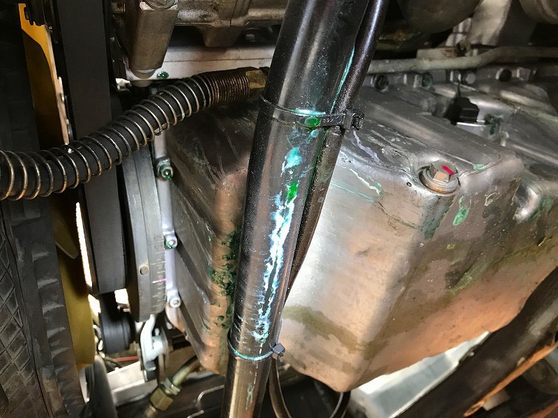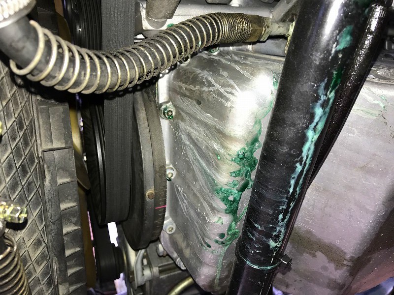 オイルパンにクーラントが垂れた跡がはっきり出ている。