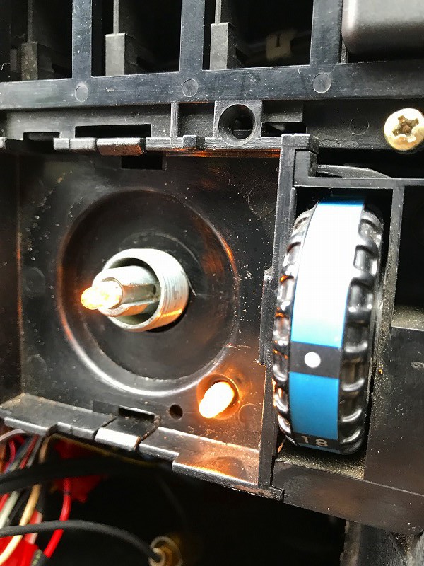 この透明プラが豆の発する光の通り道になって、温度調整ダイヤルを灯している。