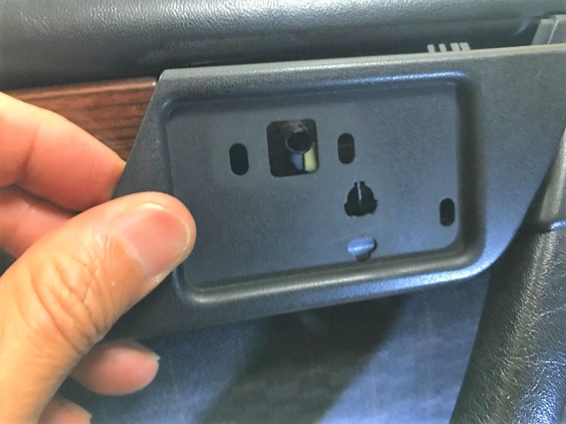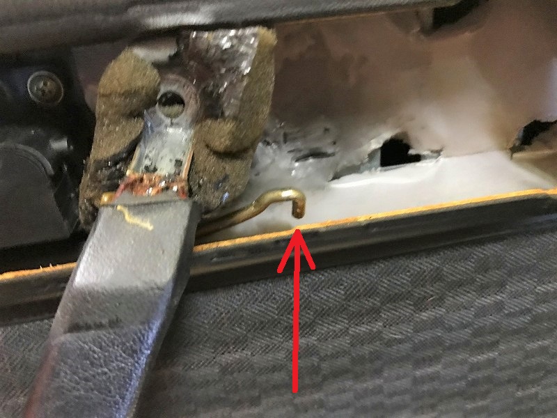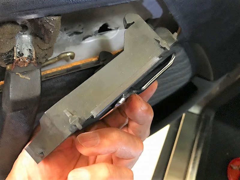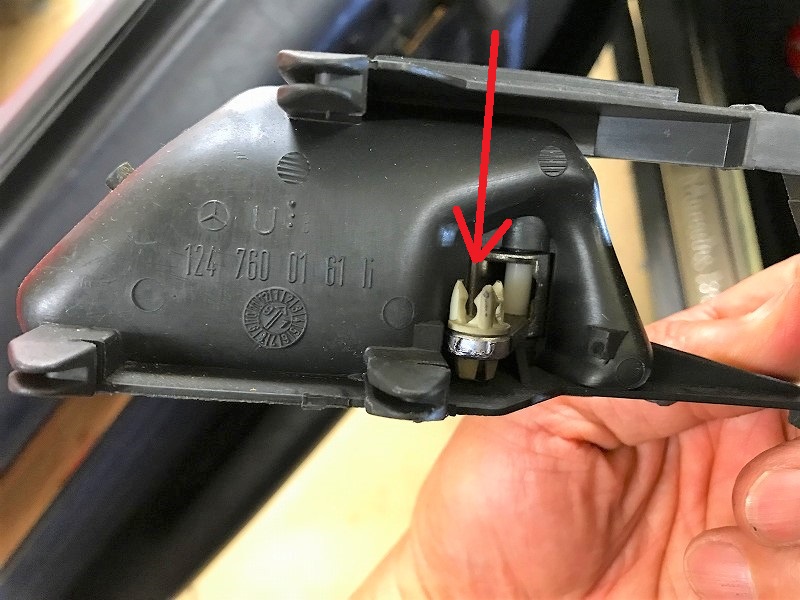左側の画像のワイヤー↑が、右側の↓に刺さっているので、ラジオペンチなどで引き抜くとドアハンドルは簡単に外せる。