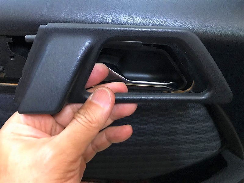 次に室内側ドアハンドルのカバーを外す。