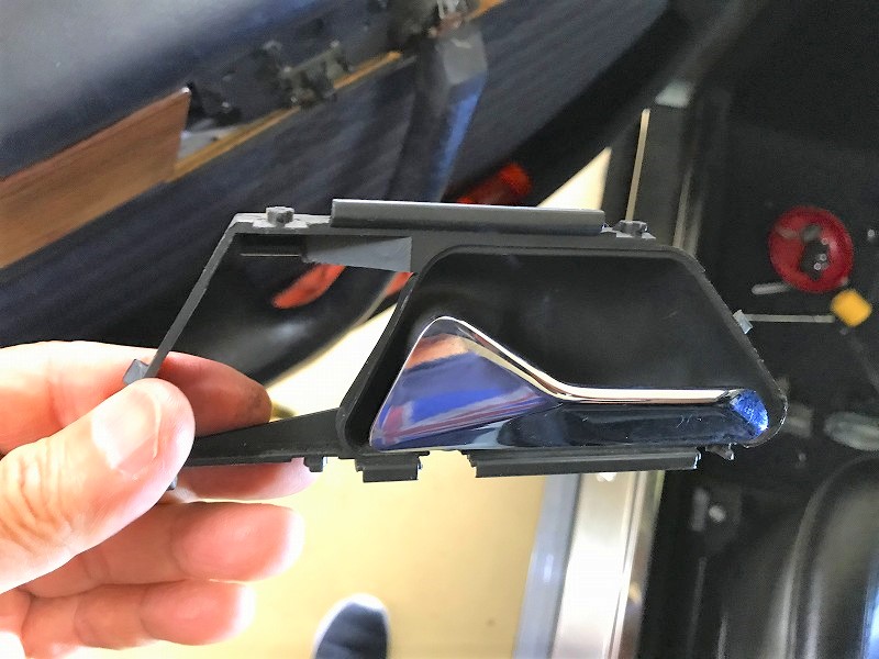 ドアハンドルを外す。 → の方向(前方向)に少し押しながらスライドさせるようにすれば外れるのだが・・・!