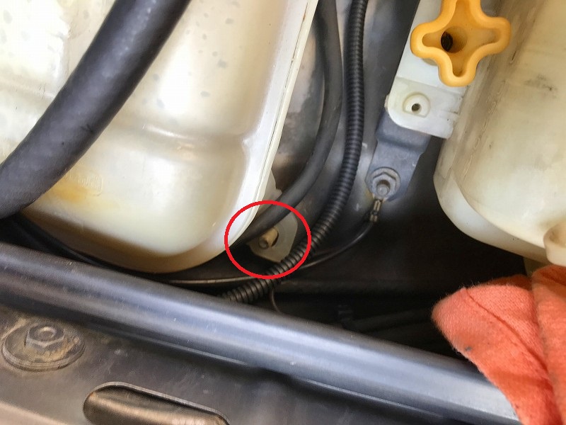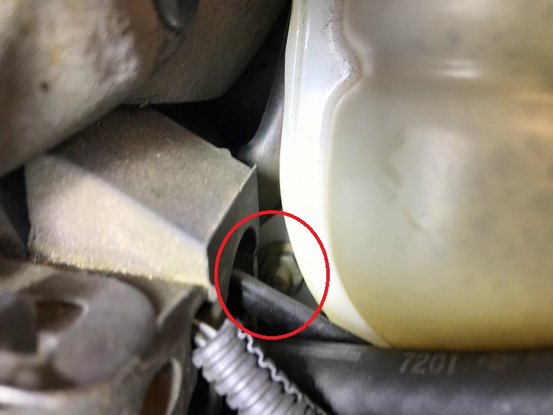 リザーブタンクを取り外すには、まず、この10mmボルト2本を外す。
