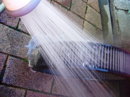 オイル汚れが落ちてきたら、水で洗い流す。 この時も指示では水圧はあまり高くしないで丁寧にとなっているが、そんな事はお構い無しにMAXの水圧で一気に洗い流す!