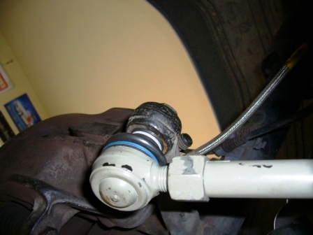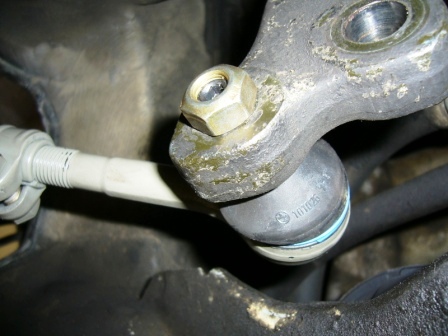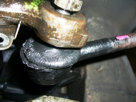 2008/10/26 先般、北海道へ小旅行にW124で出かけたときに、低速走行時に左フロント下から「ゴキッ、ゴキッ!」と嫌な音が聞こえていたので、下回りを点検するとタイロッドエンドのブーツが完全に潰れて破れているではないか! たぶん原因はこれだな!