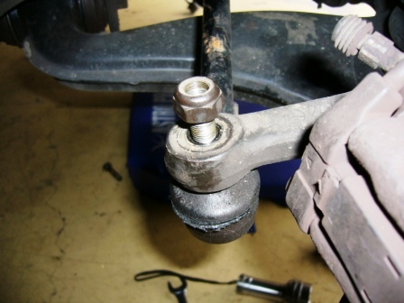 右側のロッドも左ほどではないが、ブーツが切れている。 タイロッドはナットを外しても外れない。 タイロッドエンドプーラーを使って外していく。 タイロッドエンドにプーラーを差込みネジを締めていくと、「バキッ!」と言う大きな音を立てて外れる! この音を初めて聞くと、何かぶっ壊れたのかと驚くような音だ!