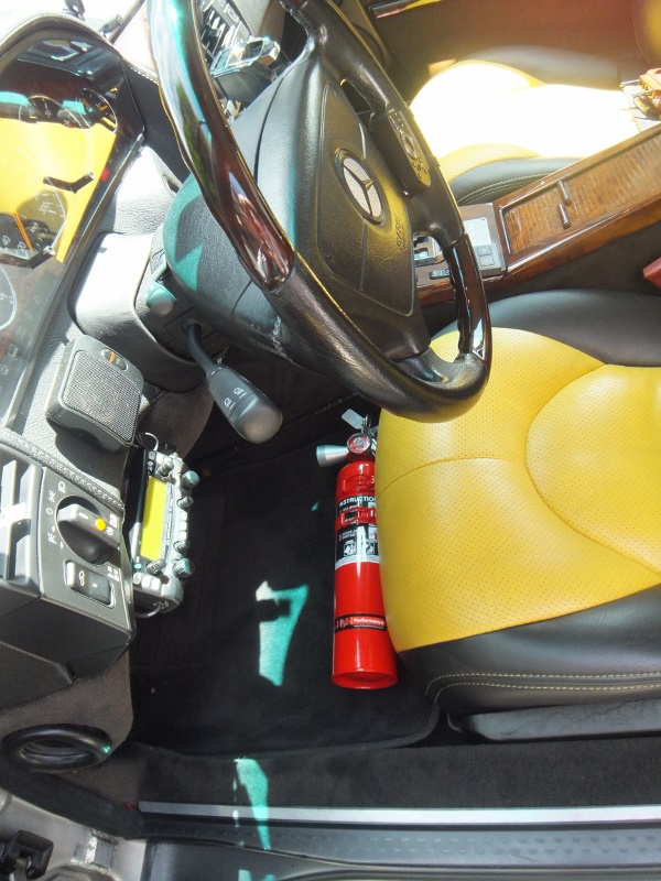 助手席下へ取り付けようと思っている消火器は粉末式なので、W124の煙モクモク事件など、万一の出火時に車外用に