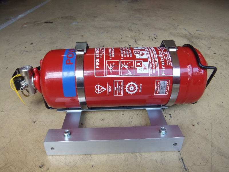 この消火器の大きさは、2Lのペットボトル位あり、サーキットで公認される位の容量がある。