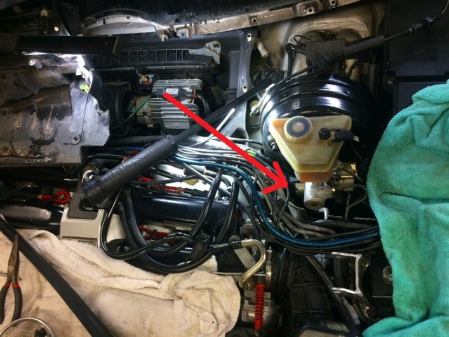ヒーターホースがあるのは、このずーと下の方なので、ブレーキマスターやリザーバータンクを外さなくては作業ができない!