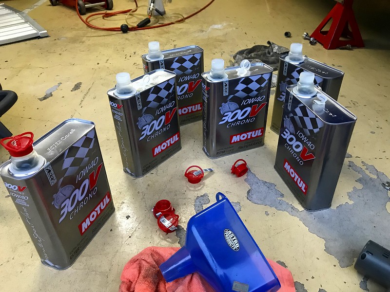 エンジンオイルやブレーキフルードのストックも充分あるし、暑さもだいぶ和らいできたので、両方交換作業をすることにした。