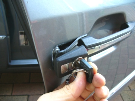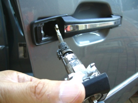 キーを差し込んで約45度くらい回しながら、車の進行方向、後方へ押すようにして手前に引けばシリンダーは簡単に外れる。