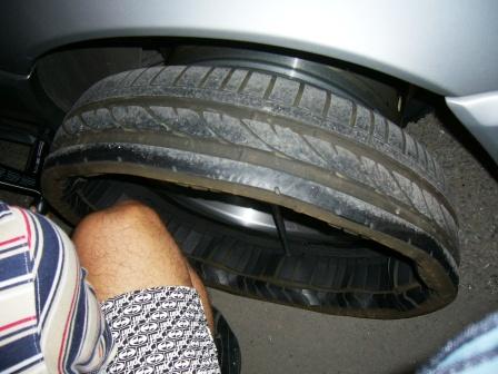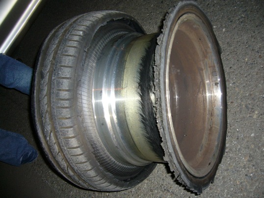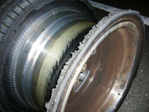 イン側タイヤ側面がちぎれて、ホイルの外までせり出している!